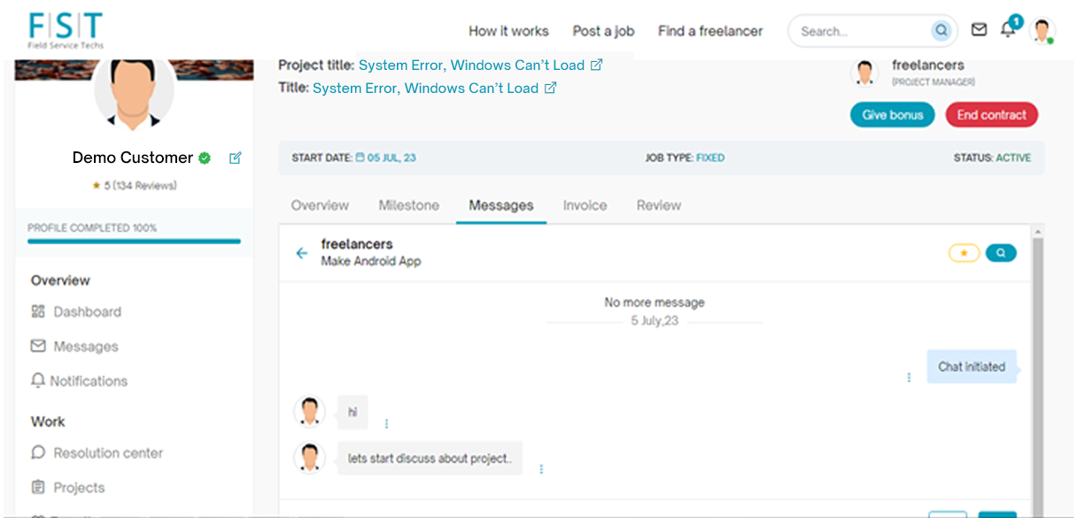 On the same page, you can locate an option called ‘Messages’. Through it, you can initiate a chat with the technician you have hired for your project. Just click on ‘Messages’ to get started. FST integrates live messaging, so you can communicate with the technician in real-time. You can reply to a text, delete a message, and edit a message by tapping on the text.