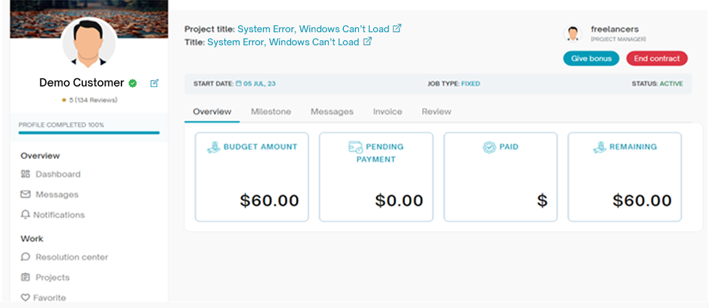 Once both you and the technicians agree to the deal, a virtual workroom will be created. There, locate the ‘OVERVIEW’ option to keep track of the project payment-related information at a glance. By clicking on the ‘Overview’ option, you can view several payment-related details like: